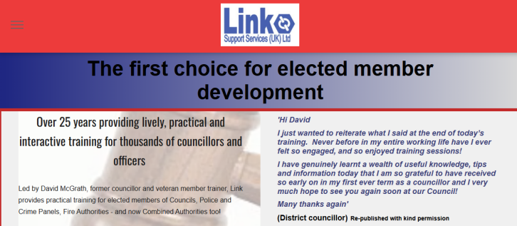 Led by David McGrath, former councillor and veteran member trainer, Link provides practical training for elected members of Councils, Police and Crime Panels, Fire Authorities - and now Combined Authorities too! Link has a large range of virtual and 'in person' short courses built specifically for councillors and delivered by expert trainers at your Council offices.
